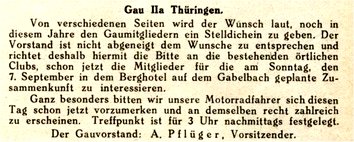 Im Jahr 1914 herrscht noch viel Aktivität mit Ausfahrten und Rennen. 1915 findet die letzte ADAC-Versammlung statt und der Vorstand wird für die Dauer des Krieges bestimmt. Karl Slevogt übernimmt wieder das Amt des Sportwartes. Danach ruhen alle Aktivitäten bis 1919. Ein Erstes Treffen nach dem Kriege wird gefordert und auch in Ilmenau am Gabelbach abgehalten, die Berichte dazu kann man hier nachlesen. Dazwichen ein Stimmungsbild von Schleiz 1919. |